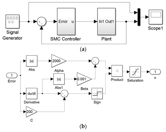 The overall simulation blocks for the controller are shown in Figure 13 and the details of the controller including the main three parameters according to Equation (17) are given in Figure 13b. There are three parameters adjusted by the controller; , and [24]. The control output shows the controller’s output for the control plant, as shown in Figure 14. The control output approaches the sliding surface and then enters the stable state, with the sliding mode output undulating during the whole process. As SMCs are of strong robustness and have fast error convergence for nonlinear systems, they are often employed not only in renewable power generation systems [25], but also in position tracking systems [26]. In literature [27], three control methods including a proportional-integral-derivative (PID) controller, H_infinity controller, and SMC have been compared with energy storage systems. The conclusion suggests that the SMC is better than the PID controller in fast response and tracking accuracy. It can also be seen from Figure 14b that the step responses regulated by a proportional-integral (PI) controller and the SMC are different. Obviously, although the parameters of the PID controller are optimized, the SMC performance is still better, with swift response and low steady state errors.