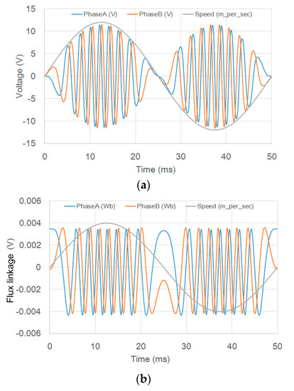 where is the flux linkage of a phase and is the flux of the phase. represents the number of turns of the windings and is the displacements of the mover. is the speed of the mover. The back EMF are proportional to and if the change rate of the flux keeps constant. If there is no local saturation for this machine, the flux of each phase without loading can be formulated as [20],