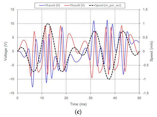 The open circuit voltage output and flux linkage of the machine are simulated as shown in Figure 15. The amplitude of the speed is 1 m/s. Under this speed, the maximum voltage is up to 12 V and the peak of the flux linkage is around 0.004 Wb. It suggests that the linear machine is capable of producing electricity at such a low speed as 1 m/s. As the speed of the wave is not a constant value, it is necessary to simulate the voltage outputs under different speeds. Figure 15c shows us the voltage outputs of the generator under a variable speed. It can be seen that the voltage outputs would increase with the increase in the wave speed. Since PMs are employed in this machine, there is no need to add an excitation current for each phase of the machine. The efficiency of the power generator could be improved for wave energy harvesting.