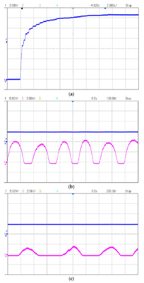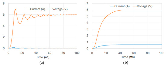 The voltage and current outputs of the DC bus under certain loads are shown in Figure 16. The reference voltage is 6 V. It can be seen that the voltage response reaches the reference value with fluctuations under a small load. As the load increases, the voltage trajectory trends to become stable gradually, with the speed gradually declined as shown in Figure 16b. The current is also increased when the load increases.