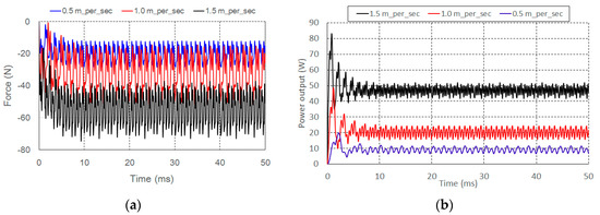 Figure 18 shows the mechanical force input and the power output under the speeds of 0.5 m/s, 1 m/s and 1.5 m/s, and the average force inputs under the three speeds are 20 N, 30 N, and 50 N, respectively. Also, the average power outputs are respectively around 6 W, 19 W, and 45 W. According to the Equation (18), the efficiencies can be calculated under these speeds and all of them are over 60%. Therefore, the efficiency of the proposed power generation method can be 60%, 63.3%, and 64.3%. The efficiency of the proposed power generation is higher than that of traditional approaches for wave energy harvesting.