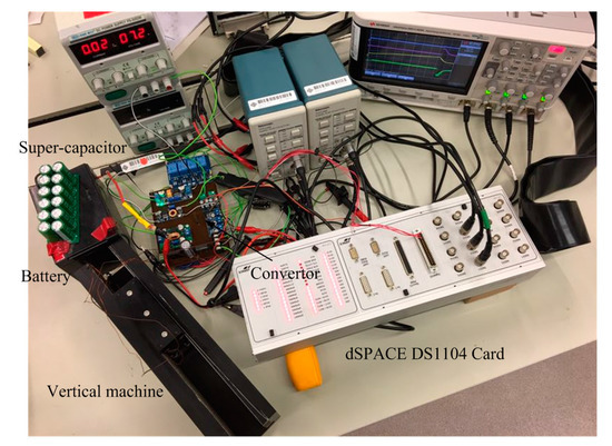 The experimental setup consists the proposed machine, the energy storage system, the dSPACE DS1104 card based controller, and loads, as shown in Figure 19. The SMC is established by using software package MATLAB/Simulink (Mathworks, Natick, MA, USA) interfaced with DS1104, by which the control algorithms coded can be directly downloaded into digital signal processor (DSP) of the card. The mechanical inputs involving the speed of the mover, phase current, and voltage are sampled. The status of the energy storage system, including currents and voltages of the DC bus and each phase can be acquired by analog-to-digital channels of the control board. Mechanical wave motions are simulated by a commercial linear motor, connected with the mover of the proposed machine via a metal rod [29]. Electrical energy is stored in the supercapacitor and then transferred to a battery.