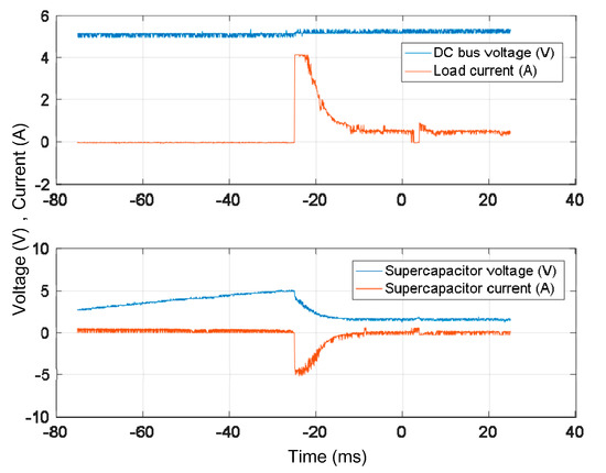 When a load is added to the supercapacitor with 1 Ω, the waveforms of the voltages from the DC bus and the supercapacitor and currents of the supercapacitor as well as the load are probed. It can be seen from Figure 23 that the voltage of the supercapacitor drops sharply due to the added load. However, the controller enters mode 3 such that the battery is connected to the DC bus and the sliding mode control method is executed, thus restoring within 1.5 s and keeping the voltage of the DC bus at a constant voltage 5 V. The constant voltage validates the effectiveness of the control method and the robustness of the power generation and the energy storage method.