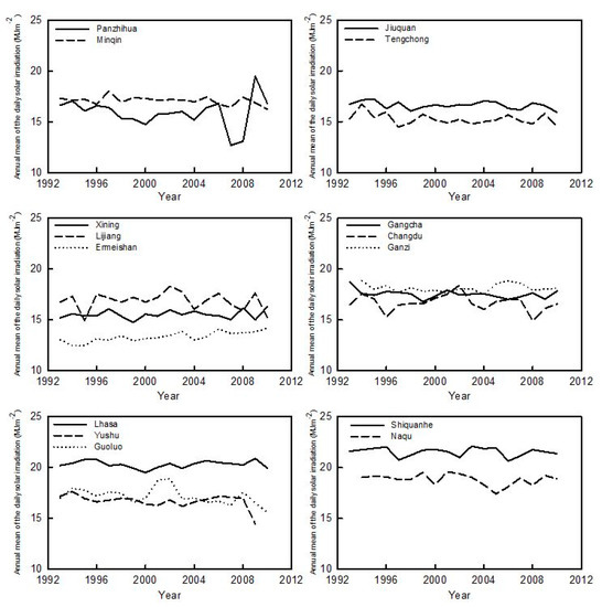 The fifteen radiation stations were classified into six groups according to altitude, and the variations of the annual mean of daily solar irradiation from 1993 to 2010 for each group can be seen in Figure 1. Generally speaking, temporal variations are relatively stable at all stations except an abrupt drop around 2008 at Panzhihua. There is a general trend that the annual mean of daily solar irradiation becomes greater with increasing altitude. The annual mean of daily solar irradiation on the TP, such as at Lhasa, Shiquanhe and Naqu, is much greater than that in its surrounding regions like Panzhihua. The lowest annual mean of daily solar irradiation occurs in Ermeishan with a value of 13.35 MJ·m−2, due to large cloud coverage. The greatest annual mean of solar irradiation occurs at Shiquanhe, with a value of 21.49 MJ·m−2. Greater annual mean of daily irradiation on the TP again validates the assumption that abundant solar energy resources are held on the TP due to its higher elevation [38,51]. These data are fundamental supports for the validation of estimated spatial radiation distribution on the TP.