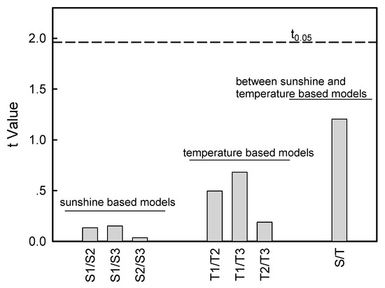 The calibrated coefficients of the site-dependent models were then used to predict daily solar irradiation at different stations, and the model performance is shown in Table 2. Comparison between Table 1 and Table 2 indicates that model prediction performed a little worse for the validation period compared to the calibration period for both sunshine- and temperature-based models, which is a normal phenomenon in the view of statistical theory [45]. However, changes in NSE and the other evaluation indicators within and between the sunshine- and temperature-based models are quite similar to those for the calibration period. Differences in model performance were further analyzed by t-test (Figure 2), and the results indicate lower t values exist within the results from sunshine- or temperature-based models, but the t value is greater between the results from sunshine- and temperature-based models (though not significant with t0.05 test), showing great difference exists between the performance of the sunshine- and temperature-based models.