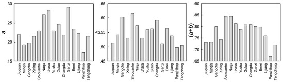 As mentioned above, the sunshine-based Ångström model is superior to the temperature-based Bristow model. Therefore, the Ångström model was selected to develop a new model for regional application on the TP and its surrounding regions. For development of the regional model, suitable equations should be established to account for the variations in the coefficients of Ångström model on the TP and its surrounding regions. Therefore, variations in the coefficients of Ångström model was analyzed first. Coefficients of a, b and (a + b) at 15 radiation stations are given in Figure 3, indicating not only a and b but also the sum of (a + b) vary greatly on the TP and its surrounding regions.