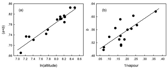 To account for the great variation in the coefficients in Figure 3, more than one hundred of different mathematical functions and variable combinations were tested to find the best equation to fit the relationship between coefficients of Ångström model and the related geographical or meteorological factors. The leading factor accounting for the variation in coefficient b was identified as water vapor pressure, and a reciprocal relation was established between the coefficient b and the corresponding averaged daily water vapor pressure (Figure 4a). We failed to find the suitable equation for fitting the coefficient a, though it is believed that coefficient a is related to cloudiness [42]. However, it was found that the sum of coefficients (a + b) correlated well to the altitude as a logarithm function (Figure 4b). Thus, the improved Ångström-type model can be expressed as follows: