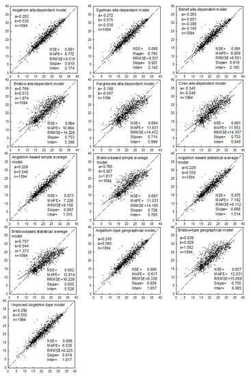 Comparison of the performance between the sunshine- and temperature-based models in Table 1 and Table 2 indicates that the sunshine-based models outperform the temperature-based ones. This conclusion is in good agreement with other studies e.g., [30,36,37], and it was also validated by a case study in Gaize in the center part of the TP [38]. Recently, observation data collected at 98 stations worldwide were used for model evaluation, and the results reconfirmed again that the sunshine-based Ångström model performed better than the temperature-based ones [39]. As all of the coefficients in the average and geographical models were from the sunshine- or temperature-based site-dependent models, the sunshine-based average and geographical models can be expected to be superior to the corresponding temperature-based ones, which have been identified by the results in Table 3 and Table 5.