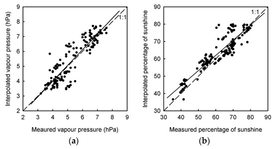The spatial distribution of the annual mean of daily solar irradiation was estimated by the improved Ångström-type model using gridded 1 km × 1 km sunshine percentage and water vapor pressure interpolated over the region. The first step was to validate the ANUSPLIN interpolation method on the TP. To do so, water vapor pressure data measured at 8 stations in the period 1993–2010 were selected as a validation dataset. Then, water vapor pressure from the other weather stations was used as input to the ANUSPLIN software to interpolate the gridded water vapor pressure data over the TP. The interpolated water vapor pressure at the 8 selected stations in the period 1993–2010 were used to validate against the measured ones, and the result of the validation indicated that a reliable and accurate interpolation could be done by ANUSPLIN interpolation method (Figure 6a). Validation of the sunshine percentage showed similar result as that for water vapor pressure (Figure 6b).