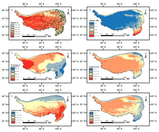 Based on these results, the spatial distribution of water vapor pressure and sunshine percentage on the TP was interpolated (Figure 7b,c), based on which the coefficients of (a + b), b and a were rasterized by the improved Ångström-type model using the ArcGIS 10.3 platform (Figure 7e,f).