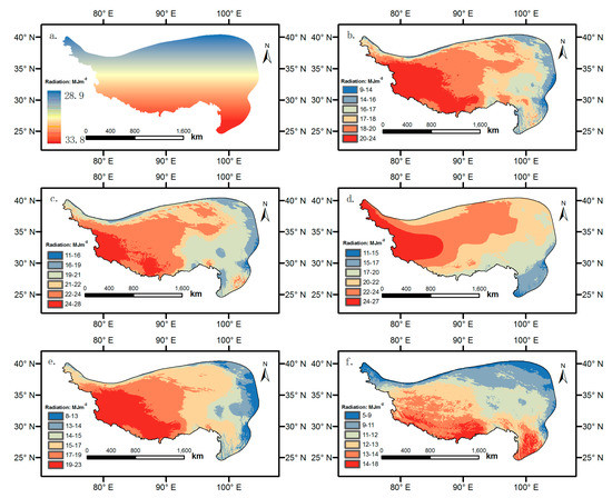 Spatial distribution of the annual mean of daily solar irradiation over the Tibetan Plateau. (a) Extra-terrestrial radiation, (b) Annual mean of daily solar irradiation, and the seasonal mean of daily solar irradiation in (c) spring, (d) summer, (e) autumn, and (f) winter (unit: MJ·m−2).