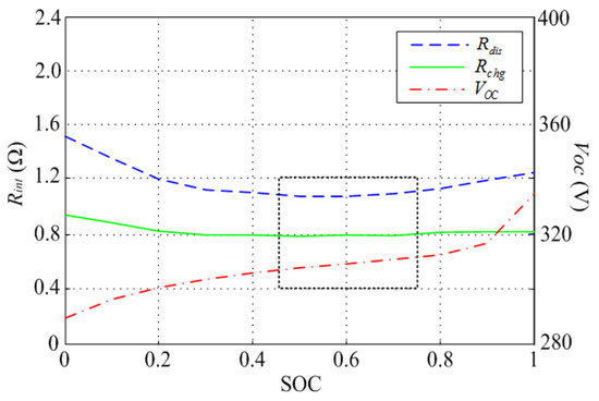 The battery charging and discharging are complex electrochemical reaction processes. Generally, the battery package is described by an equivalent circuit model that is composed by a voltage source in series with a resistance. As shown in Figure 2, both the open-circuit voltage VOC and the internal resistor Rint are associated with the battery SOC. The battery efficiency is defined as: