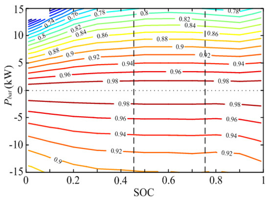 where , indicates the battery is discharging and indicates the battery is charging. As shown in Figure 3, the battery efficiency is related to its output power and SOC, so the battery efficiency model can be expressed as [37]: