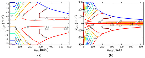 Efficiency MAP of motor/generator MG1/MG2 and its controller. (a) MG1 and its controller; (b) MG2 and its controller.