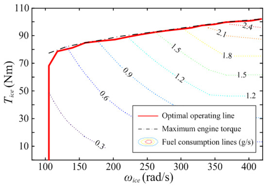 The PMP-based global optimal control strategy attempts to search for the optimal control variable to minimize fuel consumption under a given driving cycle. As shown in Figure 6, the fuel consumption rate is a function only related to engine power . Then, the total fuel consumption can be treated as the integral performance index: