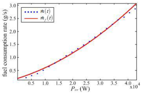 As mentioned above, the engine can be adjusted to work on the OOL (see Figure 5). Each working point of OOL has the minimum fuel consumption for a given engine power. Therefore, the fuel consumption rate can be regarded as a function only related to the engine power (see the point line in Figure 6) and the fuel consumption over a driving cycle is equal to the integral of . In order to apply the linear quadratic optimal control theory, the curve fitting method is used to approximate as a quadratic polynomial of engine power , that is: