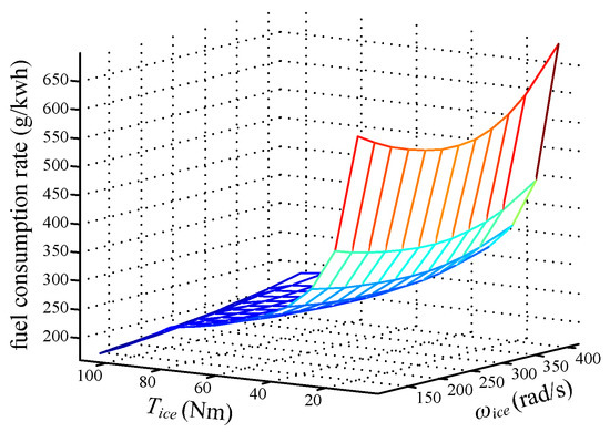 The Toyota Prius is powered by a 1.5-L 1NZ-FXE four-cylinder gasoline engine. As shown in Figure 8, the fuel consumption model is used to describe the input/output characteristics of engine, and the fuel consumption rate can be defined as: