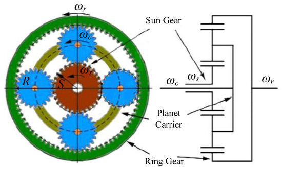 The planetary gear consists of three basic components: sun gear, planet carrier and ring gear (see Figure 9). The motor/generator MG1 is connected with the sun gear and the engine is connected with the planet carrier. The motor/generator MG2 and the final drive are connected with the ring gear. Since the rotation direction of engine is unchangeable, the rotation direction of planet carrier can’t be reversed. Both the sun gear and the ring gear can rotate forward and reverse, so the rotation speed of any gear can be determined by the other two gears. Assuming that the radius of the sun gear is S and the radius of ring gear is R, the speed and torque of these components should satisfy the kinematic constraints as Equations (47) and (48):