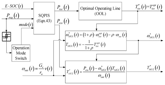 At last, the control command of engine, motor/generator MG1 and MG2 will be generated in the third part. The OOL has been converted and stored in a data table (see Figure 5). The corresponding engine optimal operating point can be derived by utilizing the interpolation and table lookup method. As shown in Figure 10, the MG1’s speed should be regulated together to make the engine operate at the given optimal working point, and the command is set equal to . On the other hand, the sum of output power from MG1 and MG2 should be adjusted equal to the battery-motor system power . Therefore, the MG2’s torque command is obtained by: