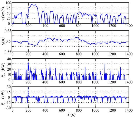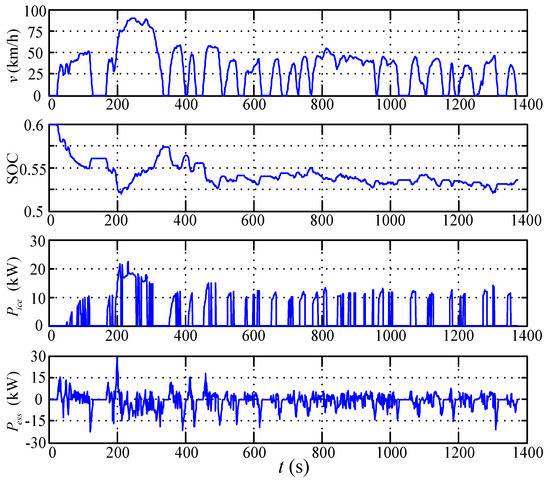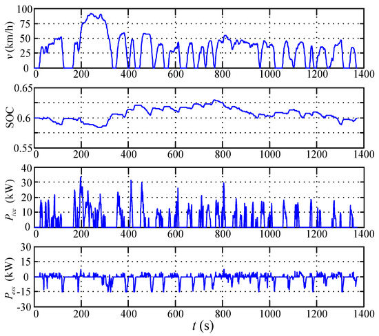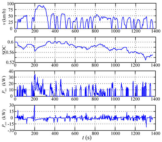 Abundant simulation tests are applied to validate the proposed strategy under some typical driving cycles. Figure 12, Figure 13, Figure 14 and Figure 15 are the simulation results of the rule-based EMS, A-ECMS, SQPIS and PMP-based global optimal strategy under the UDDS driving cycle respectively. The initial value and desired value are set to 0.6. In order to make comparison analysis among different strategies, when the final value is not equal to the initial value , the charge deviation will be converted into corresponding virtual fuel consumption by equivalent method. The equivalent fuel consumption (EFC) could be expressed as: