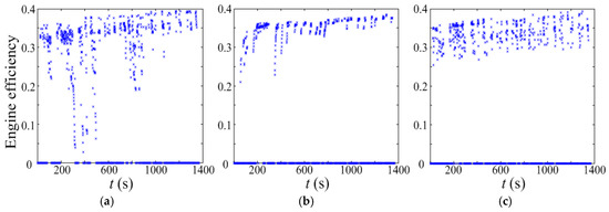 Engine efficiency distribution under urban dynamometer driving schedule (UDDS) driving cycle. (a) rule-based EMS; (b) SQPIS; and (c) PMP-based strategy.