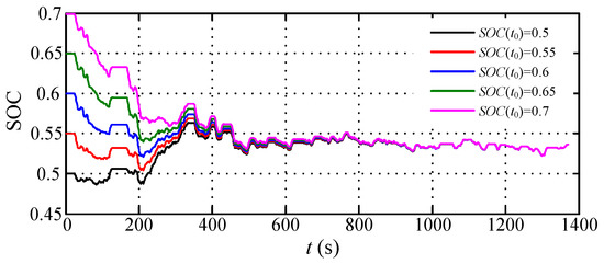 As mentioned above, when the initial value is set to 0.6, the final value obtained by SQPIS can be brought back near to the desired value . However, in the actual driving process, the initial value may be not 0.6. For the PMP-based global optimal strategy, the co-state variable has to be adjusted off-line according to the initial value . But for the SQPIS, it is easier to be implemented without changing any weight coefficient. When the initial value ranges from 0.5 to 0.7, the SOC trajectories under UDDS driving cycle are given in Figure 17. The simulation results indicate that the SOC trajectories tend to be convergent after 460s and the final values are same under different initial battery SOC. The adaptability of the proposed strategy SQPIS is exhibited.