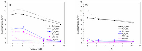 The effect of H/C mole ratio on the concentration of C2H2, C2H4 and CH4 in the pyrolysis product of n-hexane (a) and toluene (b), exp.: experimental data, cal.: calculated kinetic data. Reaction conditions: = 5.0 Nm3/h, I = 80 A, P = 14.5 kW, B = 0.058 T, m-n-hexane = 15.0–42.0 g/min, m-toluene = 10.0–25.0 g/min.
