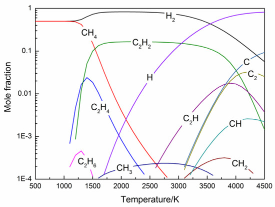 According to the kinetic analysis, with increasing the H/C ratio, the system temperature varies from 1720 to 2800 K. As shown in Figure 3, the C2H2 was the predominant hydrocarbon product over a wide range of 1700–3500 K in the equilibrium system, which is consistent with the kinetic simulation results. However, the simulated equilibrium C2H4 concentration was lower than the CH4 concentration, which is different with the experimental result (Figure 2 and Figure 3). It indicates that the product distribution of pyrolysis is kinetically controlled, which is similar to the results of references [26]. Ethylene is the major intermediate for the formation of acetylene [36,37], and lower temperature is favorable for the production of ethylene. In fact, the pyrolysis reaction only takes milliseconds, thus the pyrolysis performance should be significantly influenced by the volatilization efficiency of liquid feedstock.