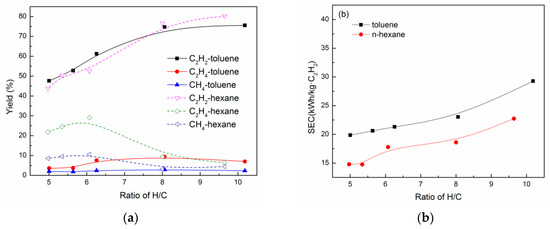 Since high temperature is beneficial for the conversion of the feed and the production of C2H2, the C2H2 yield increased for both the n-hexane and toluene pyrolysis with the increase of H/C ratio (Figure 4). Although the conversion efficiency of hydrocarbon should be improved with a decreasing feed rate due to the rising energy input per mass feed, the specific energy consumption (SEC) of C2H2 increased because the total C2H2 amount decreased with lower hydrocarbon feed rate (higher H/C ratio). Attributed to the high sooting tendency of the aromatic compound [38,39], the n-hexane showed a lower SEC than the toluene, which is consistent with the results that the straight-chain hydrocarbon shows lower energy consumption for acetylene production than the aromatic hydrocarbon [6,25].