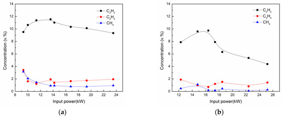 The effect of power input on the concentration of C2H2, C2H4 and CH4 in the pyrolysis product of n-hexane (a) and toluene (b). Reaction conditions: (a) RH/C = 6.5, = 4.0 Nm3/h, m-n-hexane = 20.5 g/min, B = 0.058 T, P = 9.3–23.5 Kw; (b) RH/C = 6.5, = 5.0 Nm3/h, m-toluene = 18.8 g/min, P = 12.3–25.2 kW, B = 0.058 T.