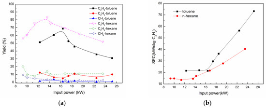 The effect of power input on the yield (a) and specific energy consumption (SEC) (b) of C2H2. Reaction conditions: (a) RH/C = 6.5, = 4.0 Nm3/h, m-n-hexane = 20.5 g/min, B = 0.058 T, P = 9.3–23.5 kW; (b) RH/C = 6.5, = 5.0 Nm3/h, m-toluene = 18.8 g/min, P = 12.3–25.2 kW, B = 0.058 T.