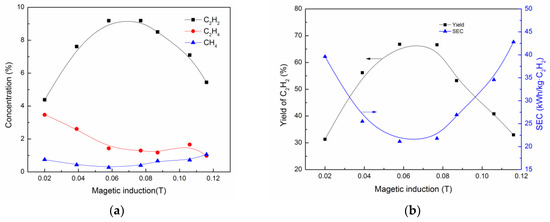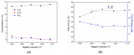 The effect of magnetic induction on the performance of toluene pyrolysis. (a) concentration, (b) yield and SEC; Reaction conditions: toluene, = 5.0 Nm3/h, m-toluene = 18.8 g/min, B = 0.02–0.10 T, I = 80 A, P = 16.0 kW).