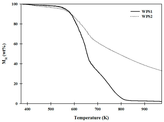 Figure 1 depicts the diagrams of thermal gravimetric analysis (TGA) for WPS1 and WPS2. It presents the variation of the residual mass fraction of the WPS (MR, wt %) with temperature (T) during the pyrolysis process. The T started from 378 K (105 °C) because the MR was calculated by the initial WPS on a dry-basis. Before the pyrolysis process, the WPS was maintained at 378 K in order to remove the moisture. According to the study by Bergman et al. [20], the pyrolysis process can be divided into three regions. Under 473 K, it involves de-polymerization, re-condensation, and softening. Before 523 K, the process consists of limited de-volatilization and carbonization. After 523 K, the biomass begins to proceed with extensive de-volatilization and carbonization.