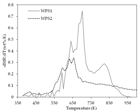 DTG curve of −dMR/dT vs. T for WPS1 and WPS2 in N2: Pre-heating at 378 K for 20 min, heating rate of 10 K/min, sample weight of 20 mg.