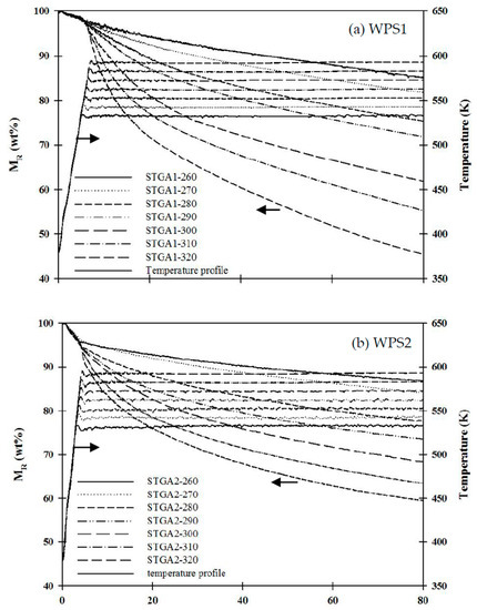 Simulated torrefaction of (a) WPS1 and (b) WPS2 via TGA at different setting temperatures. STGA1-260 and STGA2-260: torrefaction of WPS1 and WPS2 via TGA at 260 °C, respectively. tT: torrefaction time.