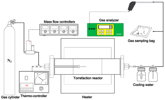 A lab-scale torrefaction system with a tube furnace(TF-35, Cheng Huei Co., New Taipei City, Taiwan) used in this study is illustrated in Figure 6. The tube is made of 314 stainless steel with an inner diameter of 6.2 cm and a length of 15 cm. For an experiment, it was firstly purged by nitrogen gas controlled via mass flow controller (Brooks Co., Charlotte, NC, USA) at 500 mL/min for 10 min before loading the sample. Then, 5 g of WPS that was loaded in a sample boat was pushed and charged into the reactor at the pre-set TT. The flow rate of nitrogen was then reduced to 165 mL/min during the torrefaction. The TT values were set at 533, 553, and 573 K for WPS1 and 553, 573, and 593 K for WPS2. The tT tested for each TT were 20, 40, and 60 min. After reaching the set TT and tT, a cooling fan was employed to quickly reduce the temperature of the tube. When the tube temperature was below 378 K, the torrefied samples were taken out from the tube and then kept in sealed glass jars with desiccants before further analysis. All gaseous products with boiling points above 298 K were condensed and collected by a condenser. Other non-condensable gases were then discharged.