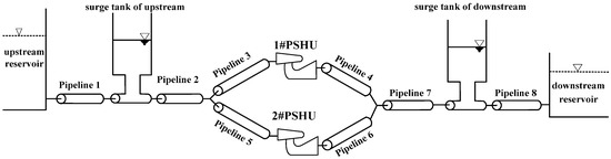 The “single tube-double unit”-type PSHU system is a typical kind of power generation system that couples hydraulic, mechanical and electrical factors, simplified mainly into four parts, namely reservoir, pressure water pipeline, surge tank and pumped storage hydro unit. Figure 1 shows a schematic diagram of the “single tube-double units”-type PSHU system used in this paper, where the PSHU system is divided into upstream and downstream reservoirs, eight pressure water pipelines, upstream and downstream surge tanks, and two PSHUs. In this section, mathematical models of each link are described.