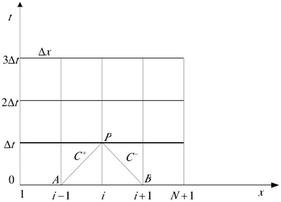 The difference network is constructed using the above simplified equation set, then the finite difference method is used to solve the problem. Figure 2 shows the characteristic line difference mesh. For Figure 2, the length of L pipeline is divided into N segments, and the length of each segment is Δ x = L / N , while the time step of the differential network is Δ t = Δ x / a .