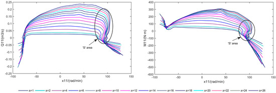 The PSHU is composed of a pump-turbine and generator, which are the key components of a PSHU system. At present, pump-turbine modeling based on the characteristic curves has been widely used. In this paper, the pump-turbine is expressed with the torque function and flow function for state variables, including guide vane opening, generator rotational speed and water head, shown as Equation (8) [32]. The analytic expressions of the nonlinear functions of f m ( ) and f q ( ) are difficult to obtain, however, based on the characteristic curves (Figure 4), torque and flow of the pump-turbine at a certain time can be calculated by means of interpolation or nonlinear function fitting. In order to overcome the obstacle of single input-multiple output during the interpolation calculation process, the logarithmic-curve-projection method is adopted for the mathematical transformation of the characteristic curves [33]: