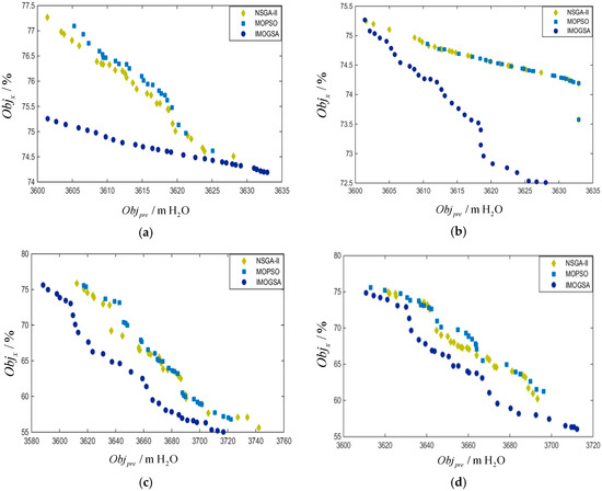 Figure 8. The Pareto front obtained by different algorithms: (a) scenario 1; (b) scenario 2; (c) scenario 3; and (d) scenario 4.