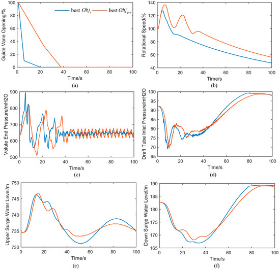 Figure 10. The transient process of minimum Objx and Objpre schemes of scenario 3: (a) guide vane closing laws; (b) rotational speed; (c) volute end pressure; (d) draft tube inlet pressure; (e) upper surge water level and (f) down surge water level.