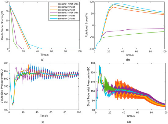 Figure 12. The transient process of 15 schemes by different scenarios: (a) guide vane closing laws; (b) rotational speed; (c) volute end pressure and (d) draft tube inlet pressure.