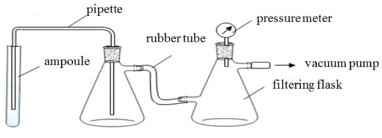 Gel strength was quantified by a breakthrough vacuum setup [], as shown in Figure 1. After all the parts were connected, the ampoule filled with sample was hooked up and the vacuum pump was started. The maximum pressure on the vacuum pressure gauge was considered as the breakthrough vacuum value (atmospheric pressure is 0.1 MPa). Distilled water and glycerol were used to calibrate the setup before measurement. The breakthrough vacuum values of distilled water and glycerol is 0.007 and 0.018 MPa, respectively. For each condition, the samples were measured three times and the average value was taken as its gel strength.