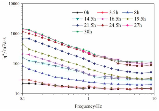 The polymer gel solution was prepared with 0.3% YG100, 0.6% resorcinol, 0.4% HMTA, polymer, and simulated formation water (pH = 5.5). The reaction was performed at 50 °C. A certain volume of solution was sampled at certain time intervals, and placed in the fridge at 5 °C to stop the reaction. The samples’ complex viscosity were given by a rheometer with a coaxial cylinder. The curves of complex viscosity vs. frequency after different reaction times are shown in Figure 2.