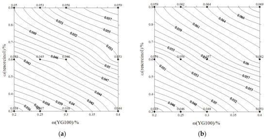 YG100 polymer solutions were prepared using simulated formation water, resorcinol and HMTA, and conditioner with different mass fractions. Too low or too high pH are not favorable for the gelation of the plugging agent system and its stability, thus the pH was controlled within the range of 5~6. Gelling conditions at different pH were compared. Experimental data are shown in Table 1. Golden Software Surfer could interpret these data as more predicted data with trend lines. Contour maps of gel strength at 50 °C are drawn in Figure 4. With limited experiments, this method gives much more gel strength data with the built-in function.