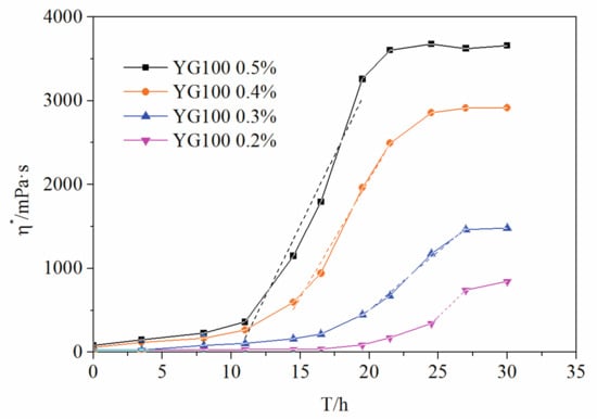 Based on the component optimization in this study, the gel solution was prepared with simulated formation water. The effect of polymer mass fraction on the crosslinking process of plugging agent was investigated at a temperature of 50 °C, while the mass fraction of resorcinol was kept at 0.6%, HMTA at 0.4%, and pH = 5.5. The effect of polymer mass fraction on the reaction process and the initial crosslinking time are shown in Figure 5 and Figure 6.