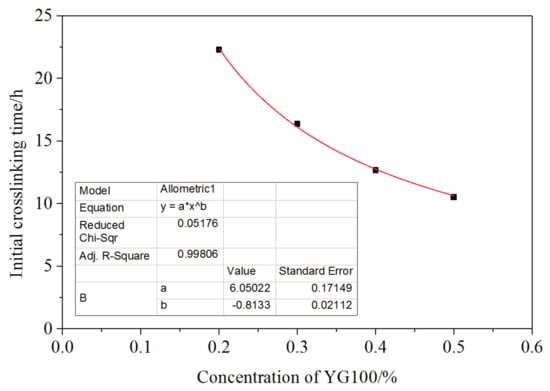 At the same time, the increased number of amide group results in a higher content of formaldehyde and phenol formaldehyde resin where they participate in the crosslinking reaction. The crosslinking reaction speeds up, and the initial crosslinking time becomes shorter. The mass fraction increase of polymer generates more crosslinking points. Therefore the complex viscosity of plugging agent system would also increase during the stable period. The relationship between the initial crosslinking time, Tg and the mass fraction of the polymer can be described as Tg = 6.05ω(YG100)−0.81 while other reaction conditions remain the same, as shown in Figure 6.