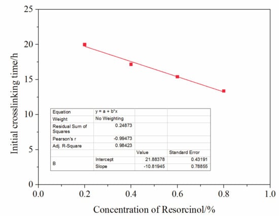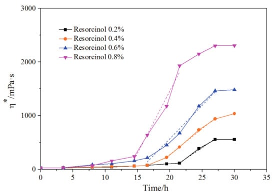 Resorcinol is the main component of the crosslinking agents. The phenolic gel was prepared with simulated formation water. The mass fraction of polymer YG100 is kept at 0.3%, HMTA at 0.4%, and pH = 5.5. The effect of resorcinol on the crosslinking process of plugging agent and initial crosslinking time was investigated at a temperature of 50 °C. The experimental results are shown in Figure 7 and Figure 8.