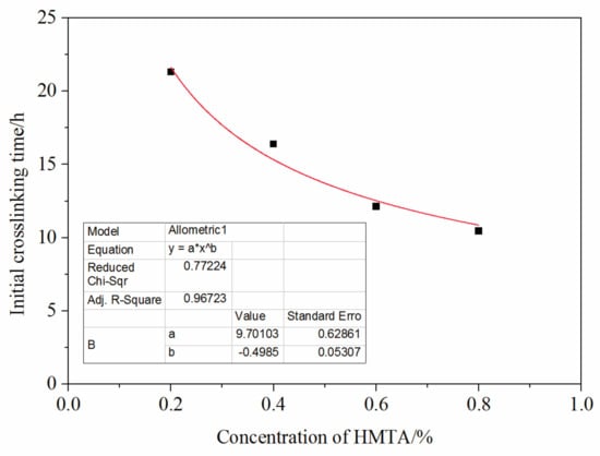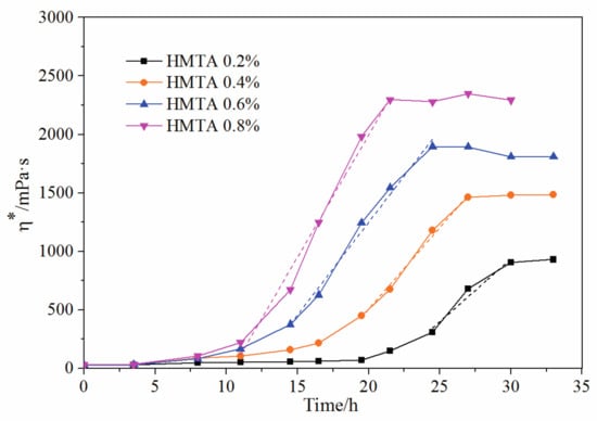 The phenolic resin is generated in the polycondensation reaction by resorcinol and HMTA, and a tight crosslinking network structure is formed by bridging the polymer chain. At the same time, the introduction of benzene rings could increase the salt tolerance and shear resistance of this plugging system. Simulated formation water was used to prepare the polymer solution. The polymer mass fraction was kept at 0.3%, resorcinol at 0.6%, pH = 5.5, temperature of 50 °C. The effect of HMTA concentration on crosslinking reaction process and the initial crosslinking time are shown in Figure 9 and Figure 10.
