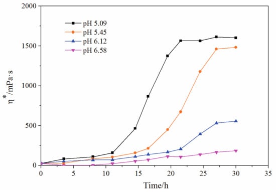 The hydrolysis reaction of HMTA producing formaldehyde and ammonia hydrate is a reversible reaction. During the reaction, the pH of solution increases. H+ neutralize the OH− which is produced by the reversible reaction, so that the reaction could proceed in the positive reaction direction, so the pH of the solution is directly related to the crosslinking reaction process. An acid environment leads to a faster reaction rate and greater crosslinking densities []. Therefore, the solution pH was adjusted from 5.08~6.58 to study the effect of pH on crosslinking reaction. The simulated formation water was used to prepare the polymer solution. Under the condition that the polymer mass fraction was kept at 0.3%, HMTA at 0.6%, resorcinol at 0.4%, the results is shown in Figure 11.